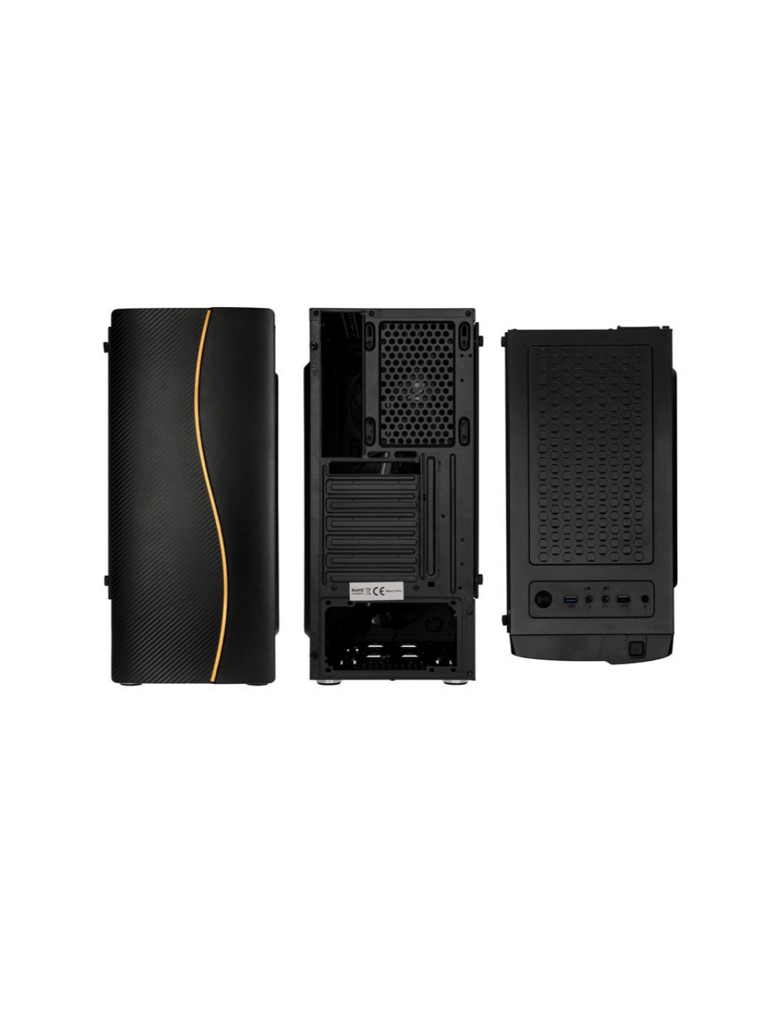 Esta caixa é compatível com motherboards ATX, Micro-ATX e Mini-ITX, oferecendo flexibilidade na escolha dos componentes. No painel frontal, encontra-se uma porta USB 3.0 para transferências rápidas de dados, uma porta USB 2.0 e duas jacks de 3,5mm para auscultadores e microfone. O controlador RGB permite controlar a iluminação da fita LED, oferecendo várias opções de cores e efeitos.