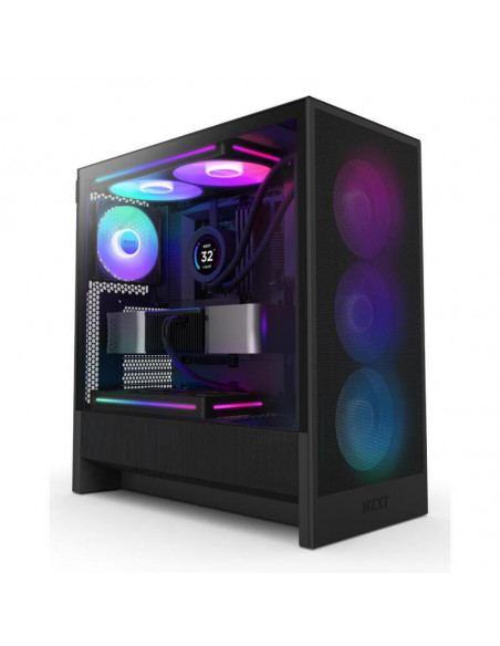A caixa NZXT H5 Flow (2024) em preto com iluminação RGB (código CC-H52FB-R1) é uma torre média compacta, cuidadosamente concebida para otimizar o fluxo de ar e a refrigeração da unidade de processamento gráfico (GPU). Esta construção inteligente integra uma tampa perfurada para a fonte de alimentação, painéis laterais e frontais em malha e um generoso suporte para radiadores, tudo isso num formato que equilibra performance e espaço. A tampa da fonte de alimentação, perfurada nos lados e na base, permite uma entrada de ar otimizada, maximizada pela instalação de dois ventiladores de 120 mm (vendidos separadamente). Para refrigeração líquida, a H5 Flow oferece suporte a radiadores de até 360 mm na parte frontal e 240 mm na parte superior, permitindo uma dissipação eficiente do calor mesmo para sistemas de alta performance. Os painéis superior, frontal e laterais utilizam uma malha ultrafina, que garante um fluxo de ar máximo, ao mesmo tempo que filtra eficientemente o pó, mantendo os componentes internos limpos e protegidos. Incluída na caixa estão um ventilador NZXT F360 RGB Core (CV) montado na parte frontal e um F120Q (CV) na parte traseira. Estes ventiladores não só garantem um resfriamento eficiente desde o primeiro momento, mas também proporcionam uma iluminação RGB vibrante, personalizável para complementar o seu setup. A gestão de cabos é uma preocupação chave para manter a organização e o fluxo de ar. A H5 Flow facilita esse processo com amplos canais para passagem de cabos, ganchos e correias para fixação, assegurando um interior limpo e organizado. Em resumo, a NZXT H5 Flow é a solução ideal para quem procura uma caixa compacta de alto desempenho, com excelentes capacidades de refrigeração e um design moderno e elegante.