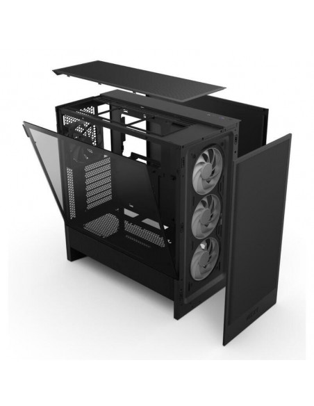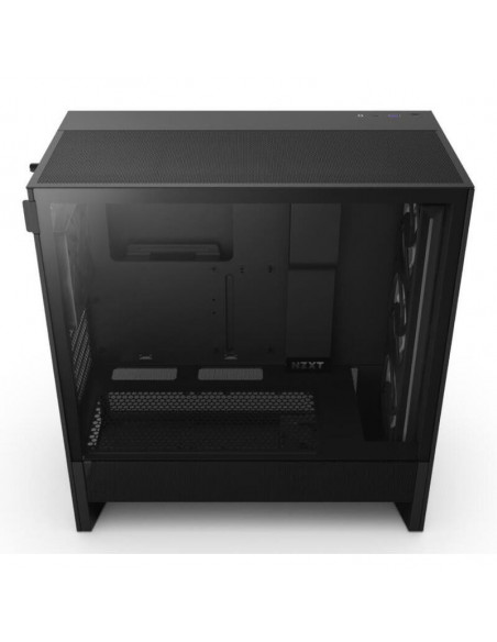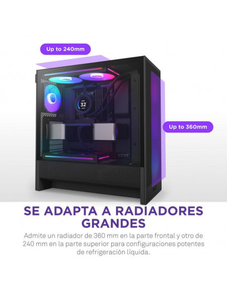 A caixa NZXT H5 Flow (2024) é uma torre média compacta, projetada para maximizar o fluxo de ar e a refrigeração da GPU. O design inclui uma cobertura perfurada para a fonte de alimentação, painéis de malha e suporte para radiadores, tudo em formato compacto. Oferece excelente refrigeração com entrada de ar otimizada por dois ventiladores de 120 mm (não incluídos) e compatibilidade com radiadores de até 360 mm na frente e 240 mm no topo. A malha ultrafina dos painéis superior, frontal e laterais garante fluxo de ar máximo e filtragem de pó. Inclui um ventilador F360 RGB Core (CV) na frente e um F120Q (CV) na traseira para refrigeração e iluminação RGB. A gestão de cabos é facilitada por amplos canais, ganchos e correias.
