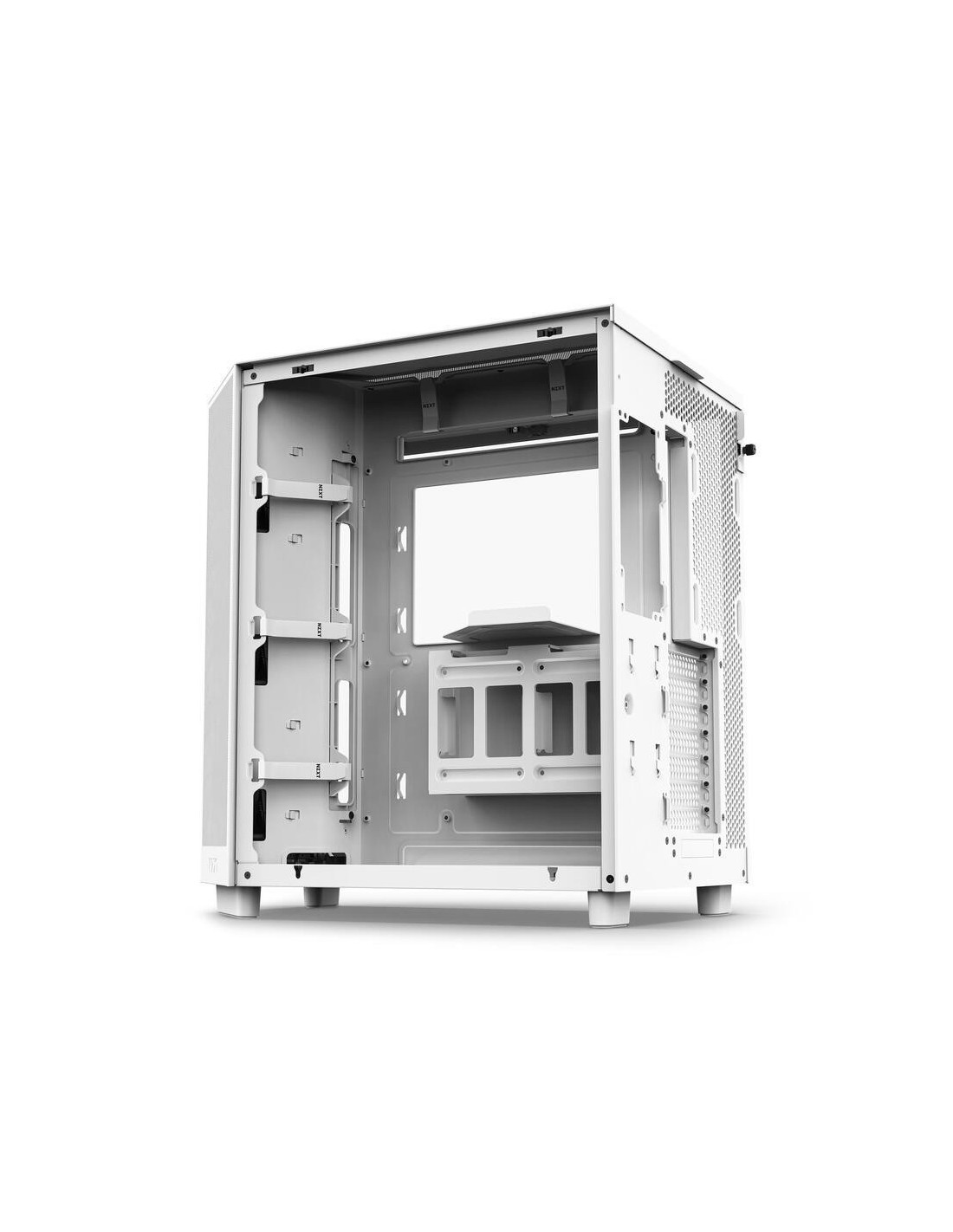 O vidro temperado nas laterais e na frente oferece uma vista desobstruída do seu sistema, permitindo apreciar a beleza da sua configuração. O design de duas câmaras oculta a fonte de alimentação, contribuindo para uma estética limpa e organizada. A caixa também inclui conectores frontais convenientes, com 2 portas USB-A 3.2 Gen 1 (5 Gbps), 1 porta USB-C 3.2 Gen 2 (10 Gbps) e entrada de áudio.