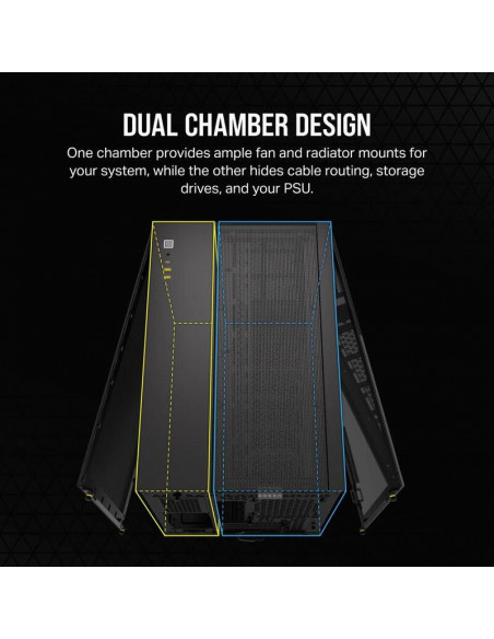 O gabinete Corsair 2500X Dual é uma excelente opção para quem procura um gabinete compacto e elegante para a sua configuração de PC Small Form Factor (SFF). Com um design de duas câmaras, este gabinete permite uma organização interna limpa e eficiente, escondendo os cabos e componentes menos estéticos numa câmara dedicada, enquanto a outra exibe os componentes principais através de dois painéis de vidro temperado. Esta solução proporciona uma vista limpa e ordenada do seu PC, permitindo que a beleza do seu hardware brilhe.