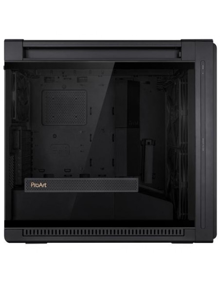 A caixa ASUS ProArt PA602 é uma torre Midi Tower projetada para construir um PC de alto desempenho com um design arrojado. O seu chassis espaçoso suporta placas-mãe ATX, EATX, micro-ATX, Mini-ITX e DTX, permitindo a instalação de uma variedade de componentes. A gestão de cabos otimizada mantém o interior organizado e melhora o fluxo de ar, contribuindo para o desempenho térmico do sistema. Um painel lateral em vidro temperado proporciona uma visão clara do interior do computador, ideal para exibir os componentes.