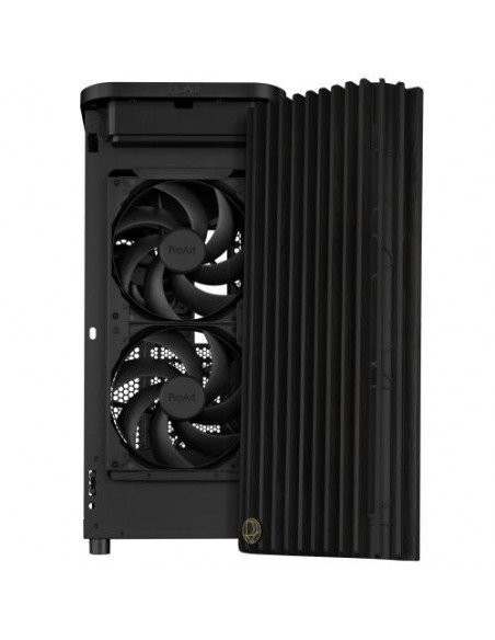 A caixa de computador ASUS ProArt PA401 Wood TG PWM é uma torre ATX de design elegante em preto, com painel lateral em vidro temperado. Inclui dois ventiladores frontais de 160mm e suporte para refrigeração líquida. Oferece espaço amplo para componentes, incluindo placas gráficas de grande comprimento.