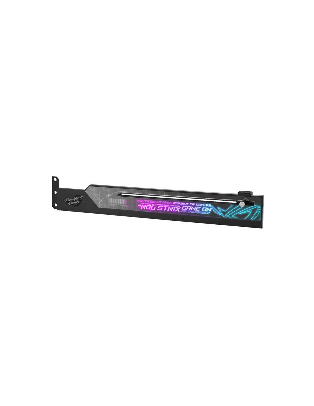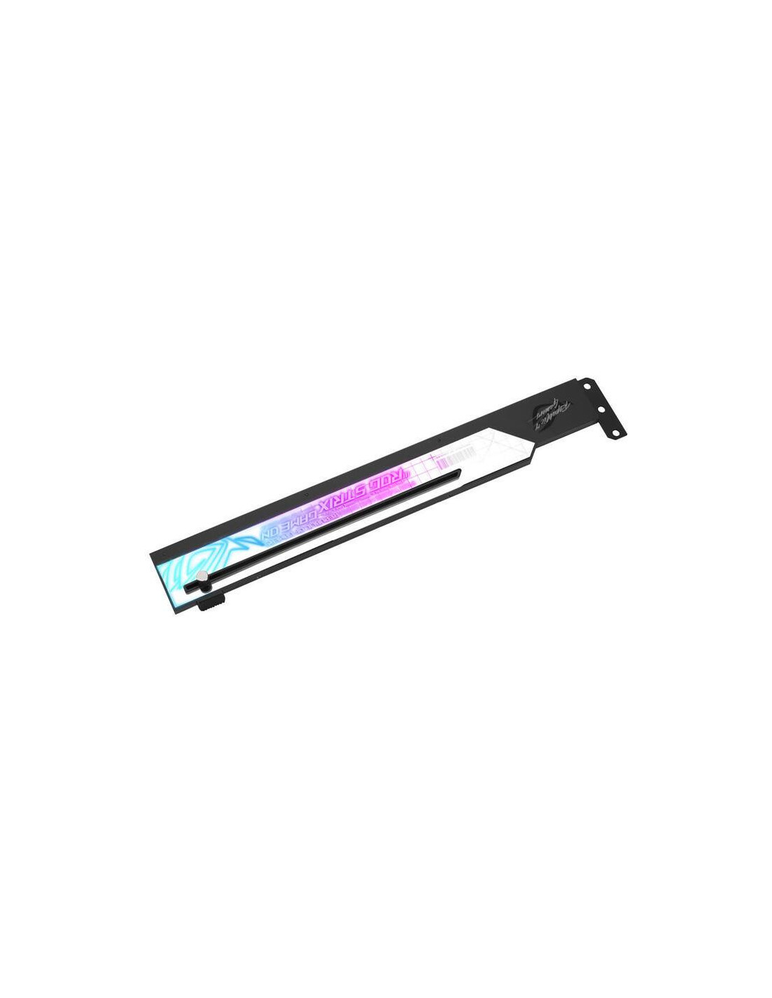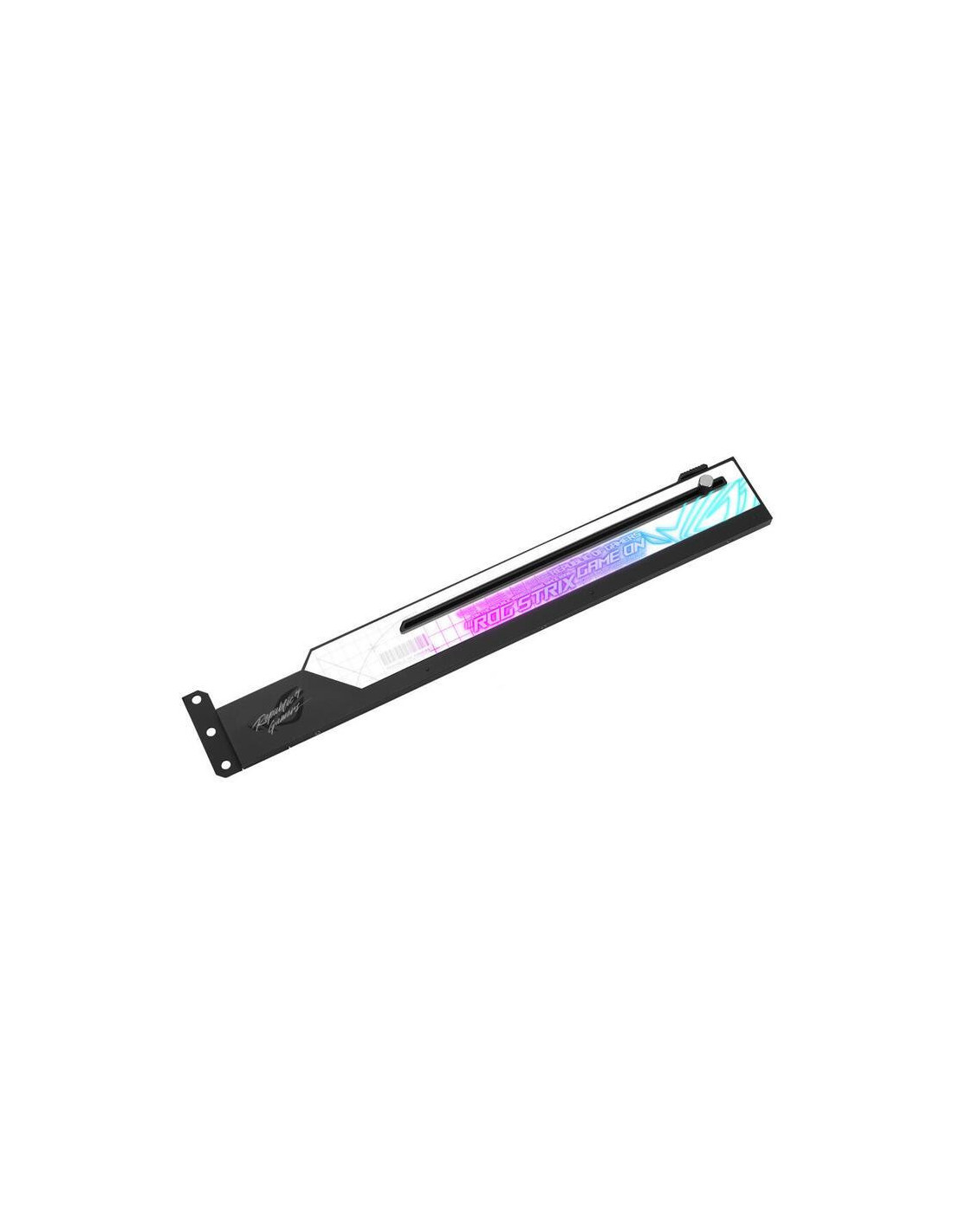 O suporte universal para placa gráfica ASUS ROG Strix oferece suporte seguro para placas gráficas pesadas, prevenindo danos e flexão. Com design elegante em preto e cinza, integra iluminação RGB configurável para personalizar a sua configuração.