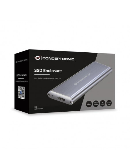 A caixa externa Conceptronic DDE03G permite conectar um SSD M.2 SATA a um computador via USB 3.1 Gen 1, oferecendo velocidades de transferência de até 5 Gbps. Construída em alumínio, garante dissipação de calor eficiente.