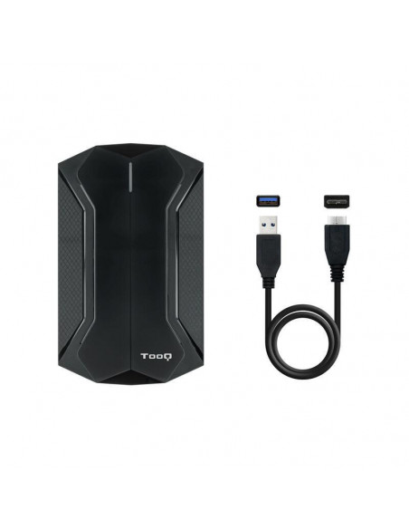 Caixa externa Tooq para discos rígidos de 2,5 polegadas, ideal para gamers.  Oferece conectividade USB 3.1 Gen 1 para transferências rápidas de dados e um design gaming com LEDs RGB. Compatível com discos SATA I, II e III.  Instalação simples e sem parafusos.