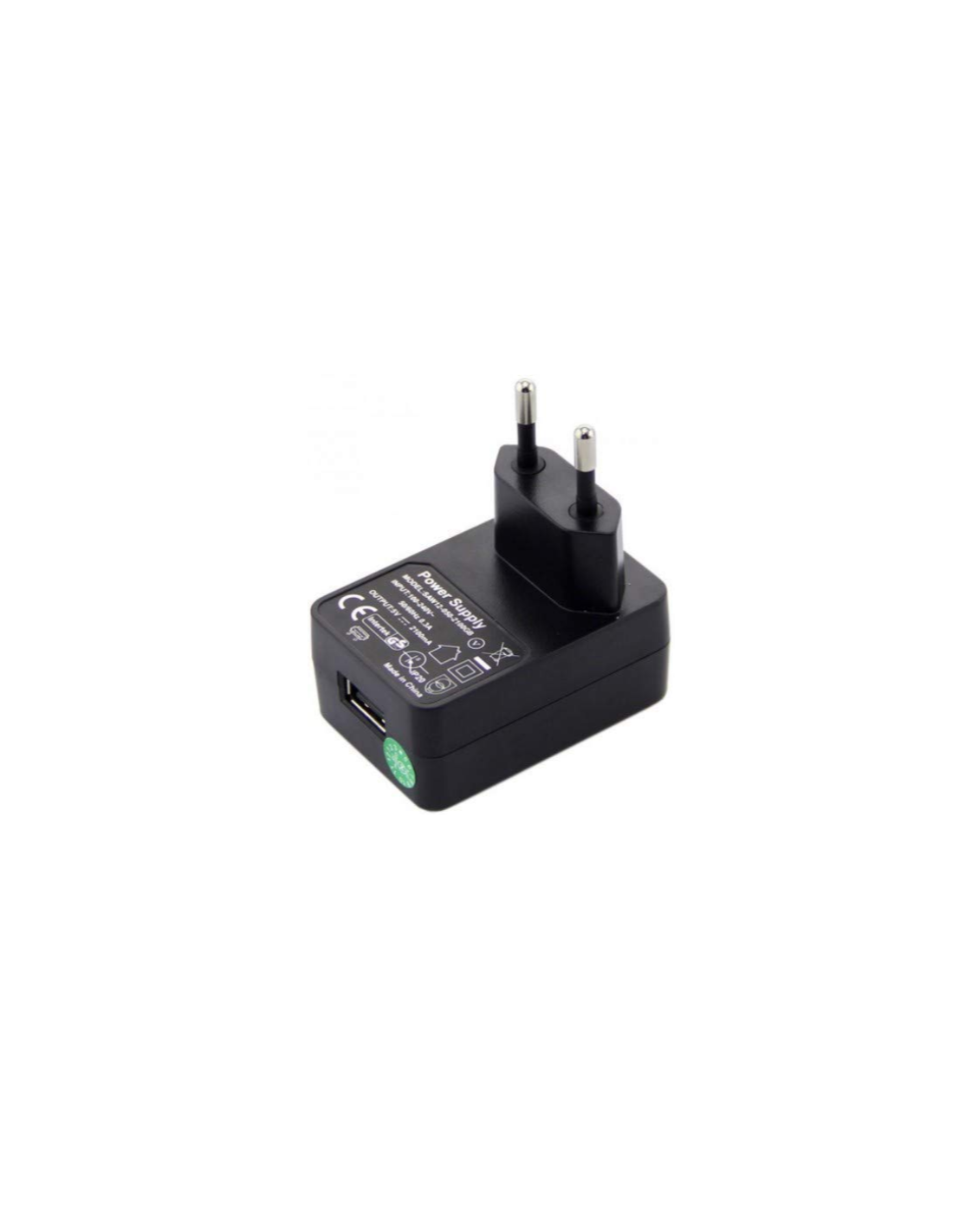 Carregador Zebra PWR-WUA5V12W0EU para terminais e PDAs. Compatível com uma vasta gama de dispositivos. Entrada: 100-240VAC, Saída: 5V, 2.5A. Ficha de alimentação europeia. Construção em plástico preto robusto.