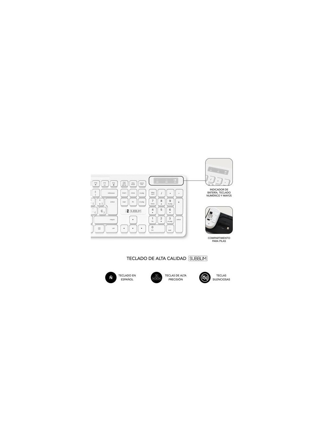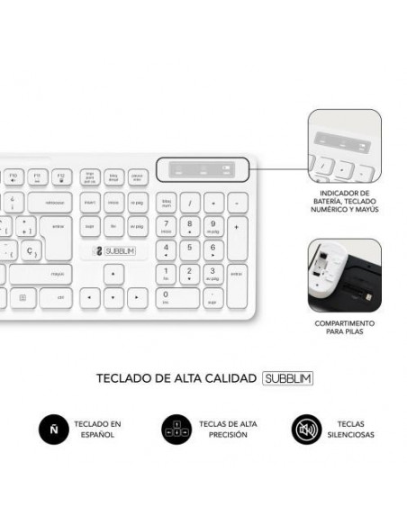 Kit de teclado e rato sem fios SUBBLIM Business Slim, silencioso e branco. Design elegante e fino, ideal para produtividade. Teclas planas e rato ergonómico para maior conforto. Tecnologia SilentKeys para funcionamento silencioso. Conectividade 2.4GHz com receptor USB unificado.