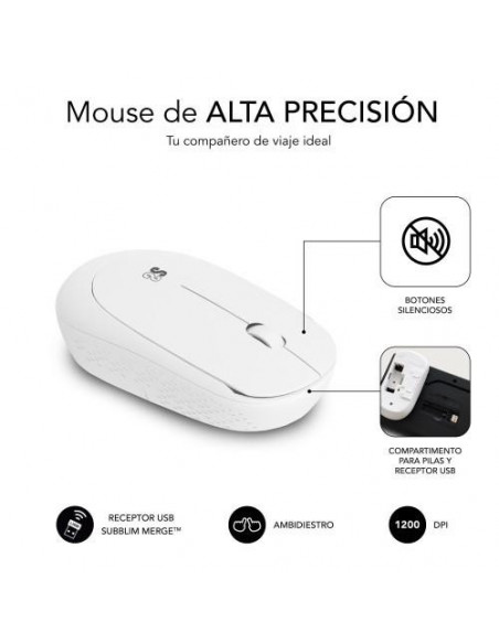 A tecnologia SUBBLIM MERGE permite conectar o teclado e o rato com um único receptor USB, oferecendo uma tecnologia sem fios avançada de 2,4 GHz, com um alcance de até 10 metros, sem atrasos ou interrupções. O rato sem fios ergonômico possui alta precisão de até 1200 DPI. A sua forma contornada adapta-se à palma da mão, proporcionando ergonomia perfeita. Os botões com tecnologia SilentClick não causam distrações e não incomodam o ambiente de trabalho.