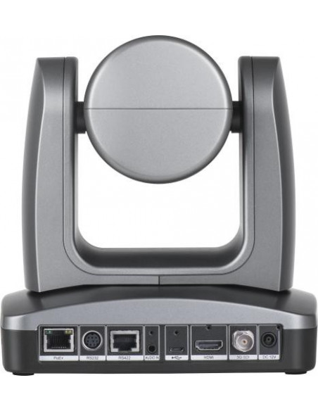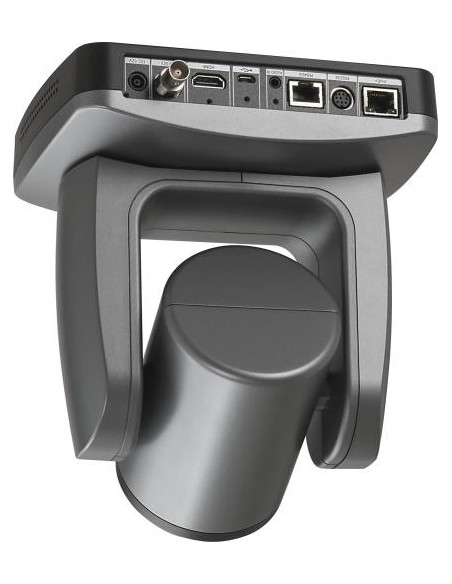 Em termos de conectividade, a PTZ310 oferece uma ampla gama de opções, incluindo HDMI, 3G-SDI, USB e RJ-45. Isto permite a integração fácil com diversos sistemas e plataformas de videoconferência. A câmara também inclui uma entrada de microfone para captar áudio de alta qualidade. O seu design compacto e elegante na cor cinzenta adapta-se perfeitamente a qualquer ambiente.