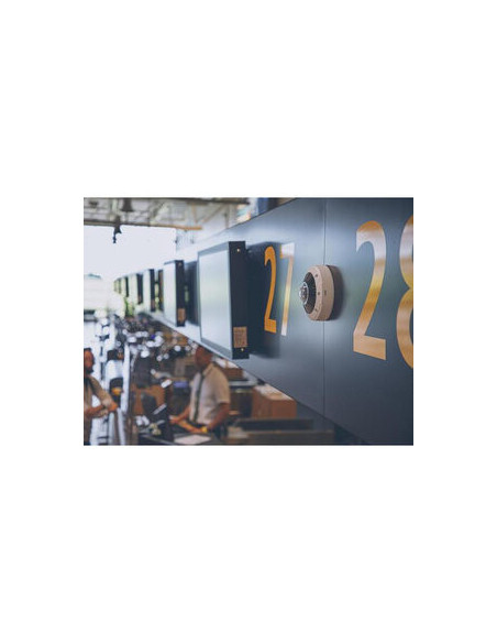 A sua lente fixa de 1,56 mm com abertura máxima de f/2 captura uma visão panorâmica de 360 graus, permitindo uma cobertura total do ambiente monitorizado. A resolução máxima de vídeo é de 2560 x 1920 a 60 fps, assegurando imagens fluidas e detalhadas. A câmara suporta os formatos de vídeo H.264, H.265 e MJPEG, otimizando a qualidade e o tamanho dos ficheiros de vídeo, de acordo com as necessidades do utilizador. A tecnologia de compressão H.265 permite uma maior eficiência de armazenamento e transmissão de vídeo, comparativamente ao H.264.