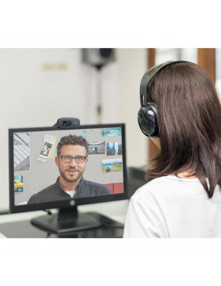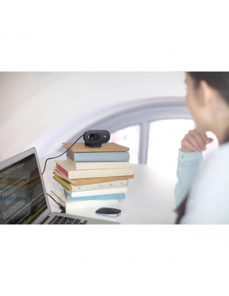 A Logitech C505e é uma webcam concebida para oferecer uma experiência de videoconferência fluida e profissional. A sua resolução HD 720p a 30fps garante imagens nítidas e fluidas, mesmo em ambientes com iluminação menos favorável. O microfone integrado omnidirecional capta áudio claro e natural a até três metros de distância, minimizando ruídos de fundo e permitindo que se concentre na conversa.
