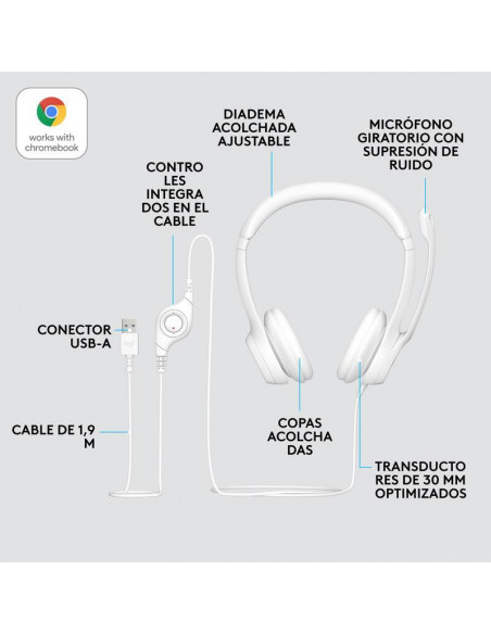 **Compatibilidade:** Os auscultadores H390 são compatíveis com Windows, MacOS e ChromeOS, garantindo uma ampla compatibilidade com uma variedade de dispositivos. O produto foi testado e certificado pelo Google para uso com Chromebooks.