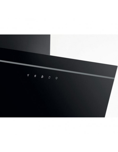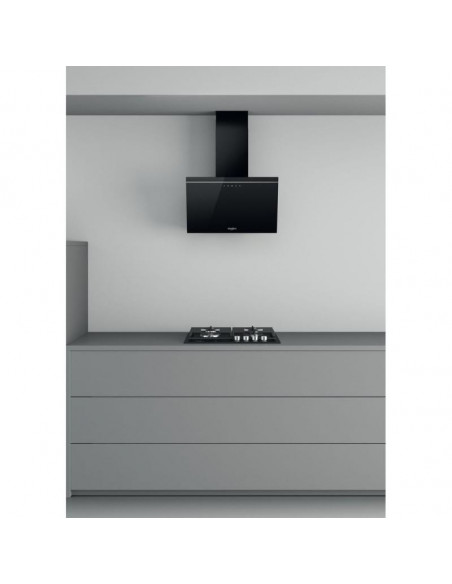 Whirlpool AKR 62F LT K. Potência máxima de extração: 650 m³/h, Tipo de extração: Conduzido/recirculante, Classe Eficiência Dinâmica Fluídos: A. Tipo: Montado na parede, Cor do produto: Preto, Material do corpo do produto: Vidro, Metal. Tipo de filtro de gordura: Alumínio. Classe de eficiência energética: A, Consumo de energia anual: 46,9 kWh, Escala de eficiência energética: A+++ a D. Largura: 598 mm, Profundidade: 326 mm, Altura (mín.): 80 cm ;