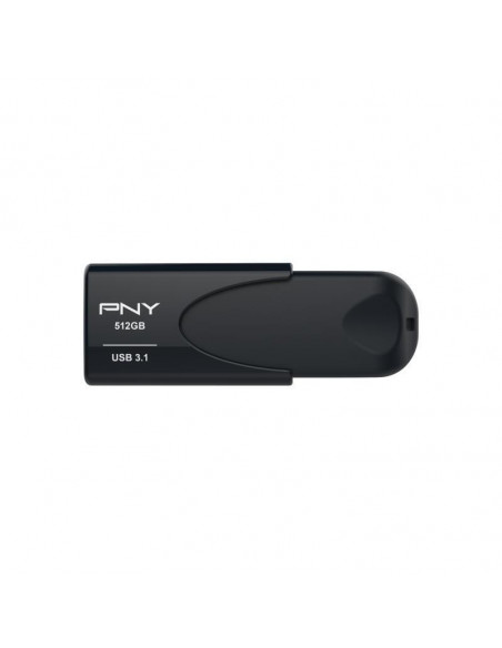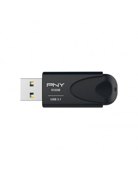 Pen drive PNY Attache 4 com 512GB de capacidade e interface USB 3.1, compatível com versões anteriores (USB 3.0 e USB 2.0). Oferece velocidades de leitura de até 80MB/s e escrita de até 20MB/s (em porta USB 3.1).