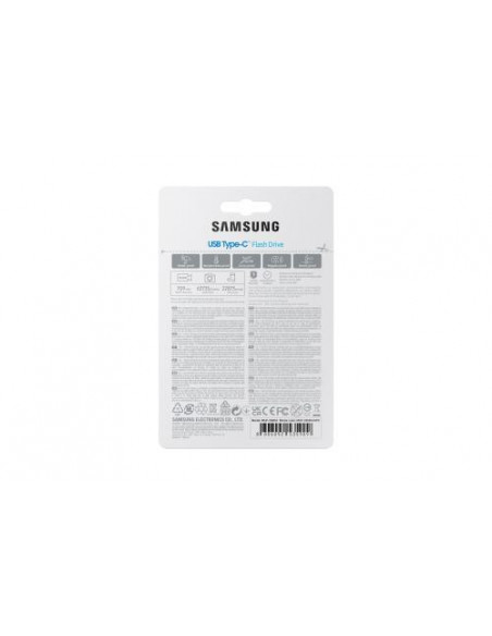Pen drive Samsung MUF-256DA/APC com interface USB Tipo-C, oferecendo uma capacidade de armazenamento de 256GB.  Velocidade de leitura de 400 MB/s para transferência rápida de ficheiros.  Design compacto e elegante na cor azul.  Resistente a água, impactos e temperaturas extremas.