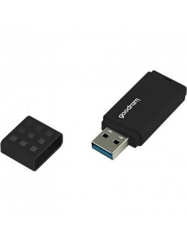 Unidade de memória USB Goodram UME3 de 64GB, com interface USB 3.2 Gen 1 para transferência rápida de dados. Design compacto e preto. Ideal para armazenamento e transporte de ficheiros.