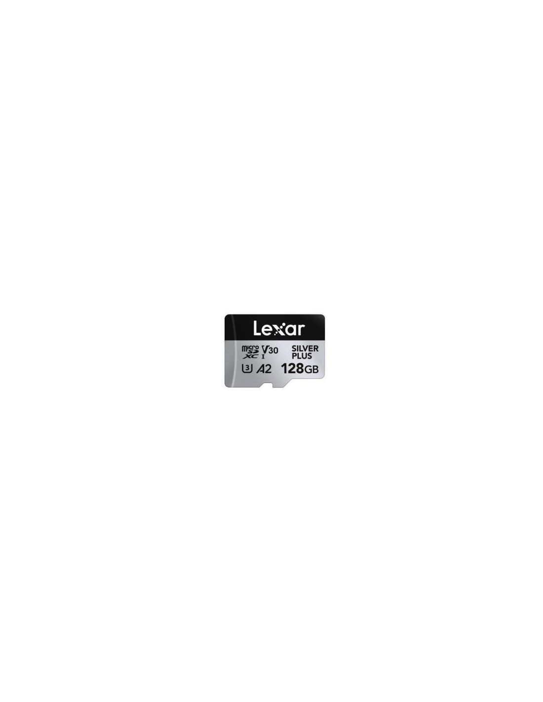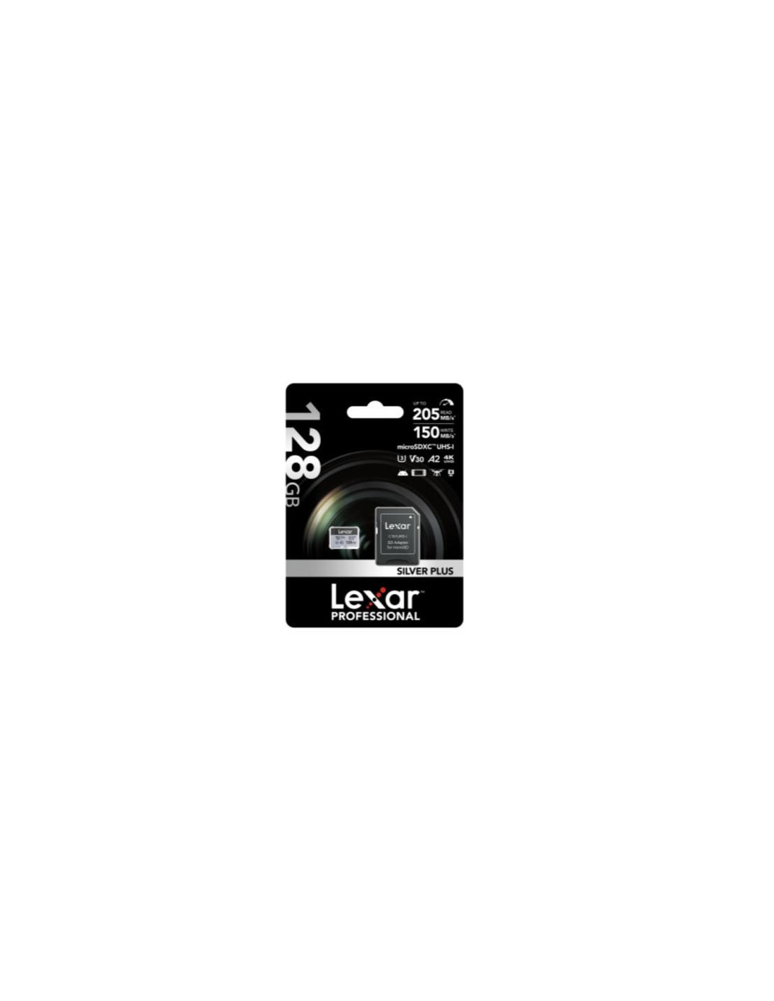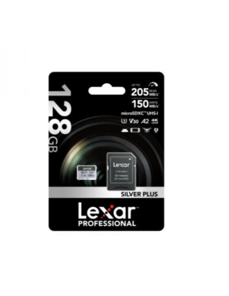 Cartão microSDXC Lexar High-Performance Silver Plus de 128GB, com velocidades de leitura de até 205MB/s e escrita de 150MB/s. Ideal para gravação de vídeo 4K a 60FPS. Inclui adaptador SD.