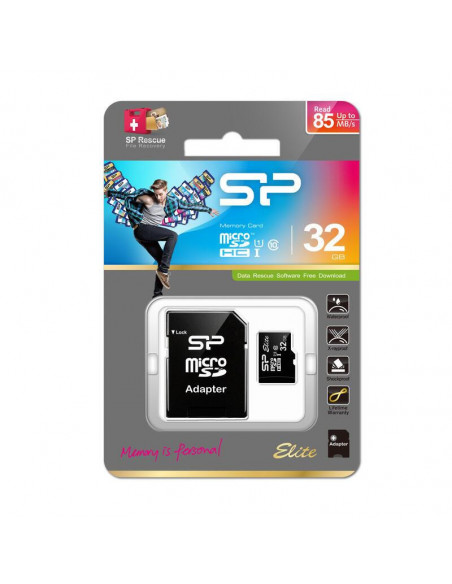 Cartão microSD Silicon Power Elite de 32GB, Classe 10 UHS-I, com adaptador. Ideal para smartphones, tablets e câmaras. Oferece velocidades de leitura de até 85MB/s e é resistente a choques, água e raios-X.