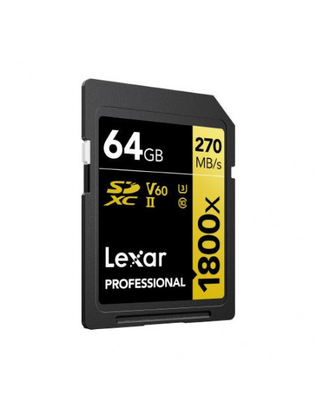 Cartão SDXC Lexar 1800x de 64 GB, ideal para fotógrafos e videógrafos que necessitam de velocidades de transferência rápidas e confiáveis.  Oferece velocidades de leitura de até 270 MB/s,  garantindo transferências de ficheiros rápidas.  Compatível com as classes de velocidade UHS-II U3 e V60.  Robusto e resistente, este cartão é projetado para aguentar choques, temperaturas extremas, vibrações e é à prova d'água e raios-X.