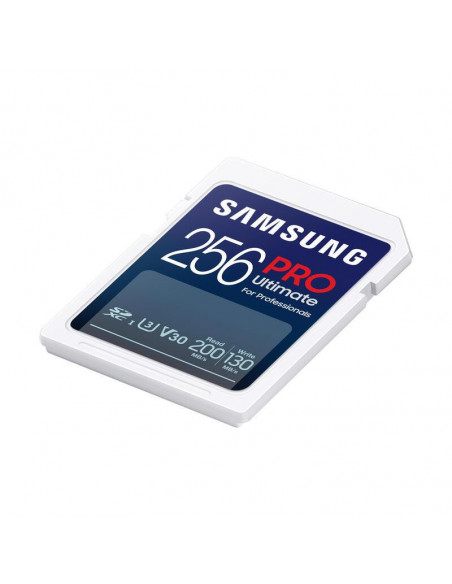 Cartão de memória Samsung Pro Ultimate SDXC com 256GB de capacidade, interface UHS-I, e classificação U3 e V30 para gravação de vídeo 4K UHD. Velocidades de leitura de até 200 MB/s e escrita de 130 MB/s. Robusto e durável, com proteção contra água, impactos, campos magnéticos, raios-X e temperaturas extremas.
