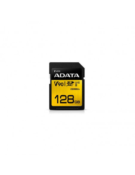 ADATA PREMIER ONE V90. CAPACIDAD: 128 GB, TIPO DE TARJETA FLASH: SDXC, CLASE DE MEMORIA FLASH: CLASE 10, TIPO DE MEMORIA INTERNA: UHS-II, VELOCIDAD DE LECTURA: 290 MB/S, VELOCIDAD DE ESCRITURA: 260 MB/S. FUNCIONES DE PROTECCIÓN: RESISTENTE A GOLPES, ANTI-ESTÁTICA, RESISTENTE AL AGUA, COLOR DEL PRODUCTO: NEGRO, ORO