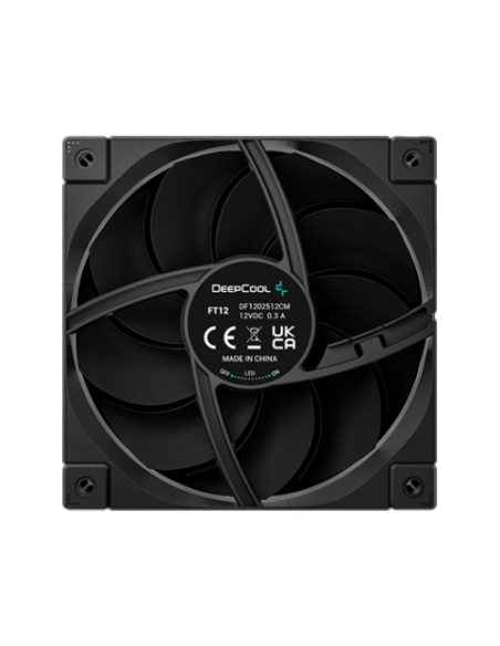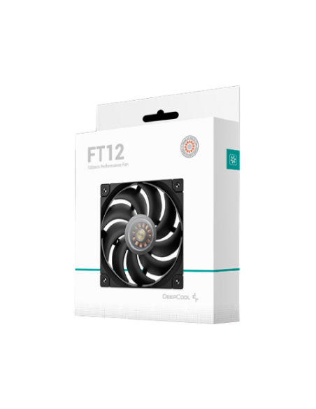 Ventilador DeepCool FT12 Black, modelo R-FT12-BKWPN1-G, de 120x120mm com iluminação branca.  Este ventilador PWM oferece um controlo preciso da velocidade de rotação, entre 200 e 2150 RPM, garantindo um fluxo de ar de até 75 CFM. Com baixo nível de ruído de 32dB, ideal para sistemas silenciosos.  Garantia de 3 anos.