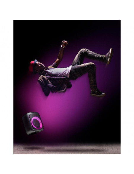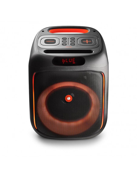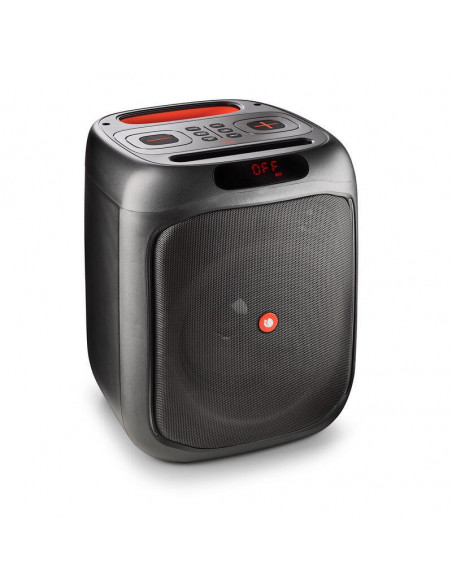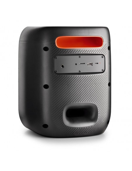 Para além da música, o altifalante também inclui uma entrada para microfone, ideal para karaokês ou apresentações. A sua construção robusta e o design moderno tornam-no um acessório ideal para uso interno em diversas ocasiões. A portabilidade é garantida graças à sua bateria integrada e à sua alça para transporte.