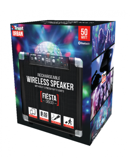 A Trust Fiësta Disco Wireless BT USRC oferece múltiplas opções de conectividade, incluindo Bluetooth com um alcance de 10 metros, uma entrada para microfone com fio (ficha de 6,35 mm) e uma entrada auxiliar (cinch estéreo). Pode ser alimentada tanto pela tomada elétrica como pela bateria recarregável integrada, que proporciona até 5 horas de reprodução contínua com o volume no máximo, e até 50 horas dependendo do volume e show de luzes. Para facilitar o transporte, a coluna possui pegas laterais, rodas e uma pega retrátil tipo trolley.