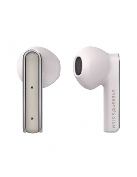 Auscultadores Energy Sistem Style 4 True Wireless, na cor creme, com design compacto e caixa de carregamento incluída.  Utilizam Bluetooth 5.3 para uma ligação estável e oferecem uma autonomia de 5 horas de reprodução contínua de áudio.  Compatíveis com a aplicação Energy Sistem eSmart Connect. Incluem microfone integrado.