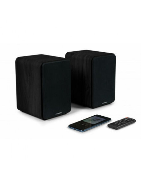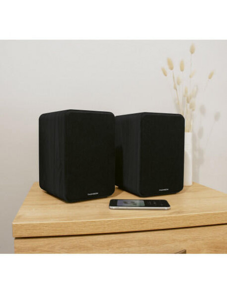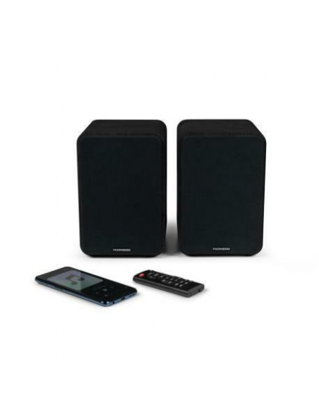 THOMSON PACK 2 COLUNAS BLUETOOTH 100 WATTS PRETA - As colunas Thomson combinam design, desempenho acústico! Seja com uso via Bluetooth ou conectados a um gira discos de vinil ou micro-hifi, é o parceiro ideal para desfrutar de um excelente som. Características: Conjunto de duas colunas, Bluetooth 5.0, Potência sonora musical: 100 Watts, Duas Entradas RCA (adaptador RCA para 3,5 mm incluído ), Entrada óptica (cabo incluído), Controlo remoto, Equalizador, Fonte de alimentação de 230V (adaptador de 19V 1,5A incluído).
