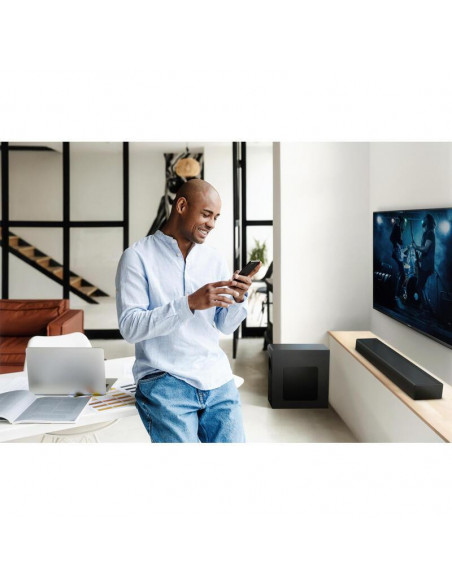 A Barra de Som Panasonic SC-HTB490 oferece um som potente e imersivo para a sua sala de estar. Com um sistema de 2.1 canais e 320W de potência, proporciona uma experiência auditiva excepcional. Desfrute de graves profundos e sons nítidos, graças ao subwoofer sem fios incluído.