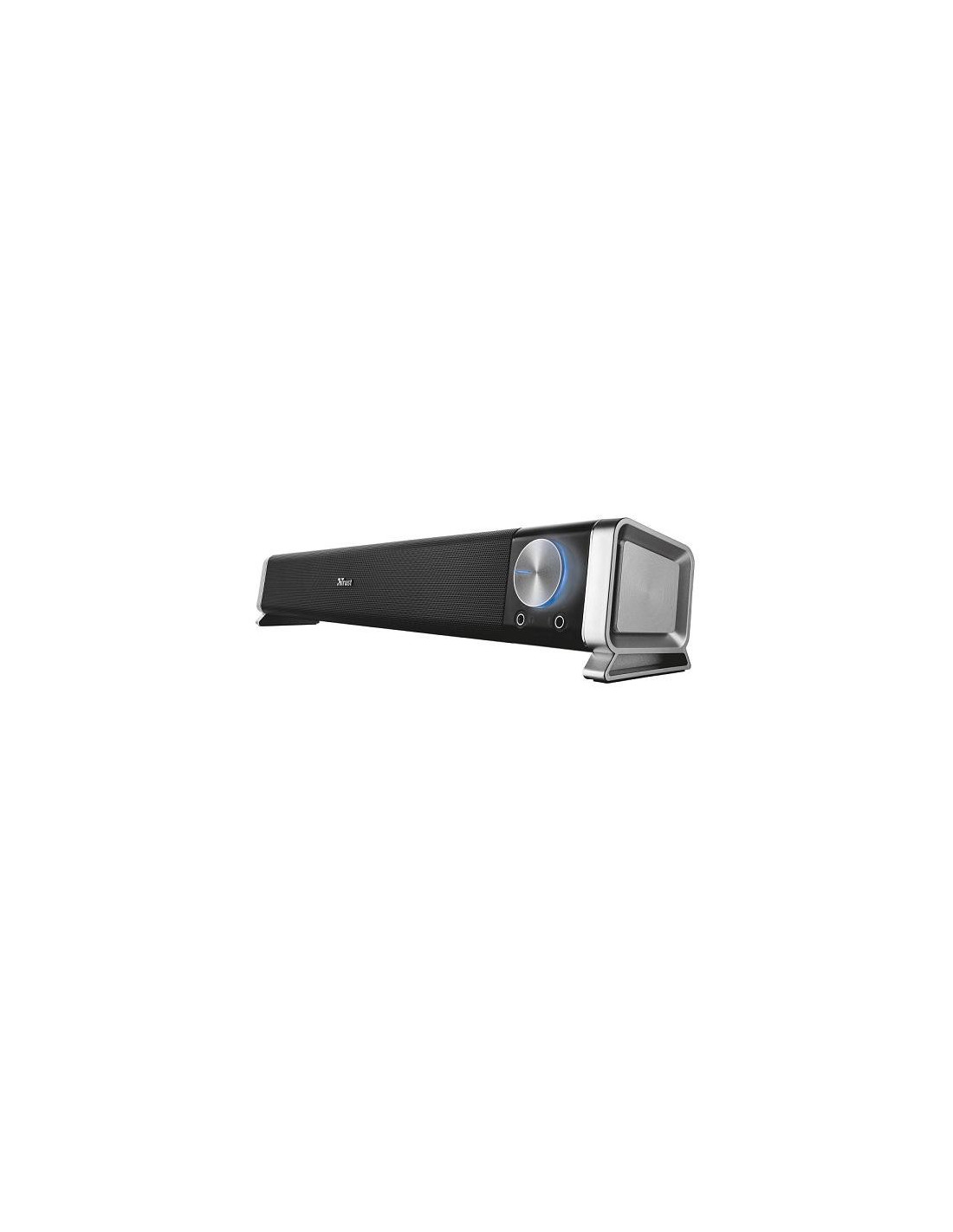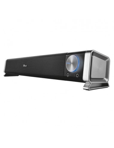 12 W de pico de potência (6 W RMS), Intenso som estéreo numa coluna compacta para caber sob qualquer monitor de PC ou ecrã de TV, Botão de controlo de volume grande e iluminado, Conveniente ligação para auscultadores e microfone na parte frontal, Alimentado por USB: dispensa ligação a tomadas de parede