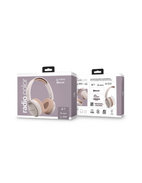 Auscultadores sem fios Energy Sistem Power Radio, na cor bege. Estes auscultadores circumaurais possuem um design sustentável, com plástico 100% reciclado. Oferecem conectividade Bluetooth 5.3, reprodução de MP3 e suporte para cartão microSD. Inclui cabo USB-C e cabo de áudio. A bateria de Li-Po de 400 mAh proporciona até 16 horas de autonomia.