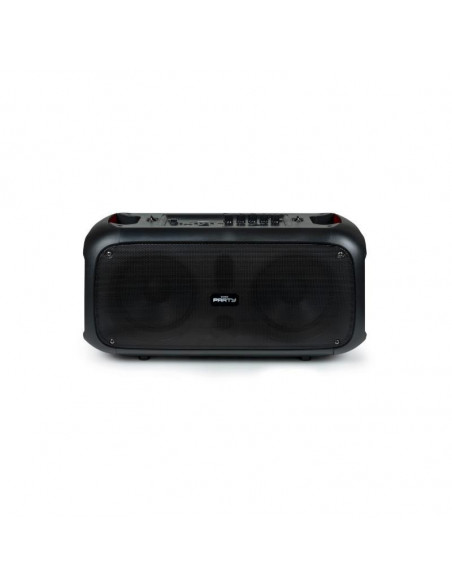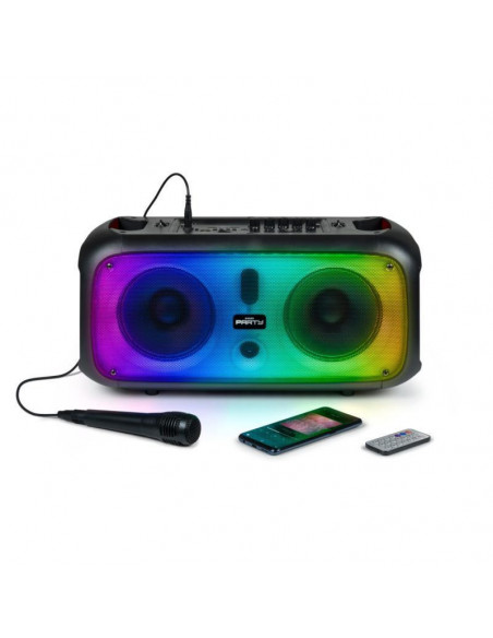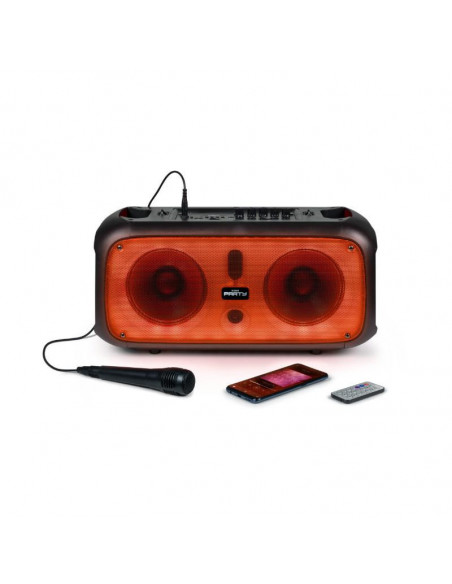 Bluetooth® 5.0; Potência musical total: 200 Watts; Impressionantes efeitos de luz (ON/OFF); Alça de ombro removível; Microfone com fio incluído; Entrada de microfone de 6,35 mm;