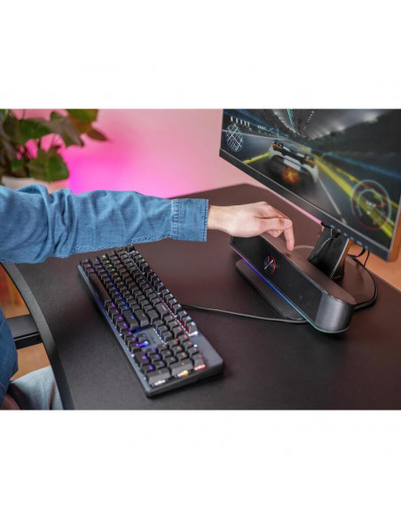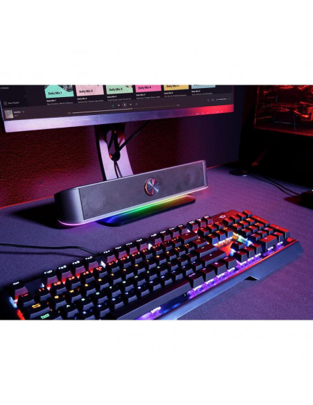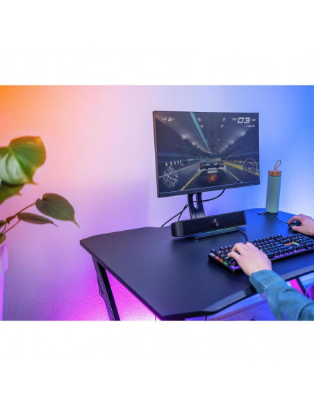 O seu design compacto é perfeito para ser colocado na sua secretária, à frente do seu monitor ou na base da sua TV, sem ocupar muito espaço. A sua versatilidade permite a sua integração em diferentes cenários, adaptando-se facilmente ao seu espaço.