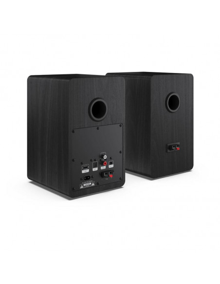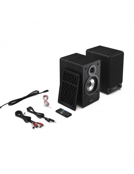 O material da caixa em madeira contribui para uma qualidade de som superior, reduzindo vibrações indesejadas. O comando remoto incluído facilita a gestão do volume e das funções, proporcionando uma utilização conveniente. Para além das suas características técnicas, as colunas incluem cabos AUX e RCA, assim como um manual de utilizador para facilitar a sua instalação e utilização.