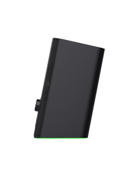 A conectividade é versátil, permitindo-lhe conectar-se através de Bluetooth para uma experiência sem fios, ou através do cabo de 3,5mm para uma conexão direta. O controlo de volume de fácil acesso e a entrada de auriculares integrada garantem um uso prático e conveniente. A iluminação RGB com vários modos de cor adiciona um toque moderno e personalizável à sua configuração.