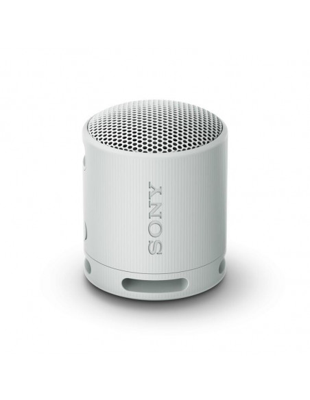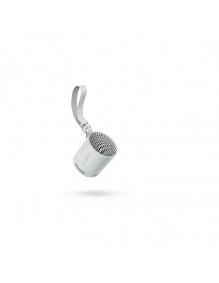O altifalante sem fios Sony SRS-XB100, na cor branca, oferece um som potente e cristalino num design compacto.  É resistente à água e ao pó (IP67), possui bateria com duração até 16 horas e inclui microfone integrado, controlo de volume e conectividade Bluetooth 5.3 e USB-C. Inclui cabo USB e correia.