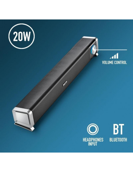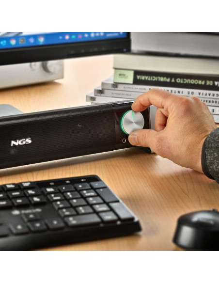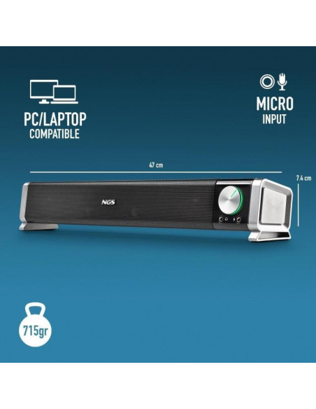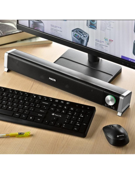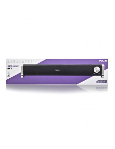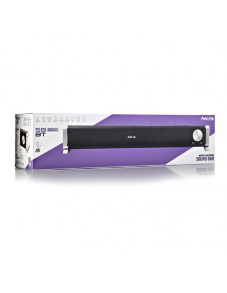 NGS SB500-BT. Canais de saída de áudio: 2.0 canais, Classificação de Energia RMS: 20 W. Potência RMS da soundbar: 20 W, Impedância: 4 ?, Rácio Signal-to-Noise (SNR): 75 dB. Cor do produto: Preto. Tecnologia de conetividade: Com fios e sem fios. Voltagem de entrada DC: 5 V ;