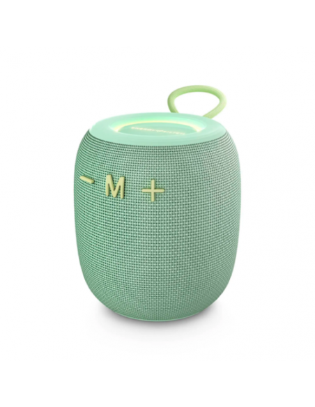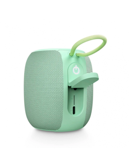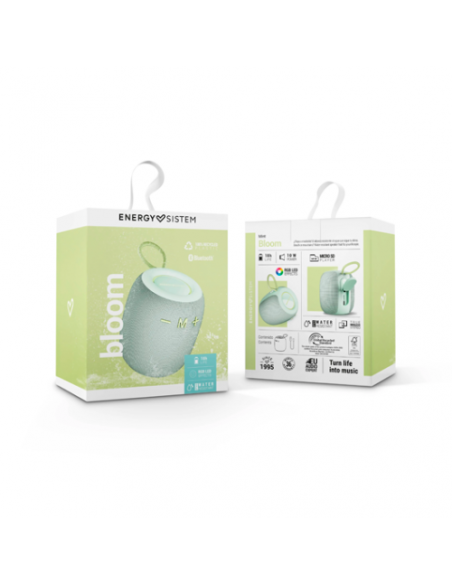 A coluna Bluetooth Energy Sistem Bloom Mint combina estilo e performance num design compacto e elegante. Equipada com a tecnologia Bluetooth 5.3, proporciona uma conexão estável e de alta qualidade com os seus dispositivos. A sua bateria de iões de lítio de 1800mAh garante até 18 horas de reprodução contínua, permitindo que leve a sua música consigo para todo o lado.  A certificação IPX6 protege contra salpicos de água, ideal para usar ao ar livre ou em ambientes húmidos. O design esférico compacto complementa o seu estilo único.  Integra um microfone para chamadas telefônicas sem fio. O carregamento é feito via USB-C, e o tempo de carga é de 3 horas. A potência de saída é de 10W. É feita com 100% de plástico reciclado pós-consumo. Dimensões: 85 x 95 x 85 mm. Peso: 330g. Garantia de 3 anos.