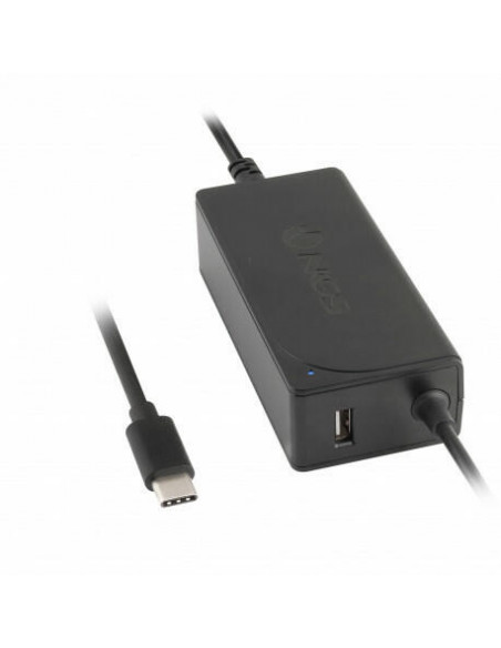 Carregador de portátil com ligação "Type-C" com até 60 W de potência. Inclui porta USB de 2A, para carregar smartphones ou tablets. Ideal para uso doméstico ou para viagens.