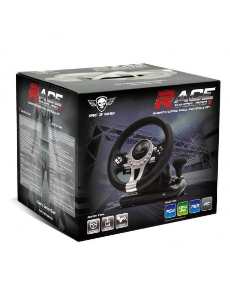 Volante de corrida Spirit of Gamer Race Pro Wheel 2 com pedais, compatível com Xbox One, PS4, PS3 e PC. Oferece duplo motor de vibração e ângulo de rotação de 180°.
