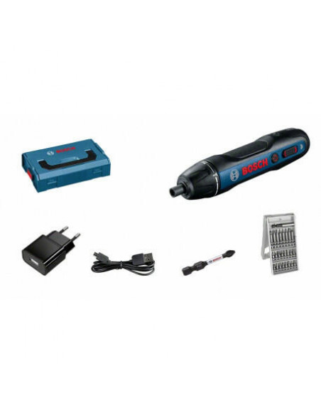 Bosch GO Professional. Tipo de produto: Chave de fendas elétrica, Forma do cabo: Pega reta, Diâmetro do mandril: 1/4". Velocidade de marcha lenta (máx.): 360 RPM, Máximo torque (aplicações suaves): 2,5 Nm, Máximo torque (aplicações fortes): 5 Nm. Fonte de alimentação: Bateria, Voltagem da bateria: 3,6 V, Tecnologia da bateria: Ião-lítio. Peso: 310 g, Comprimento da embalagem: 162 mm, Profundidade da embalagem: 280 mm. Número de baterias incluídas: 1 unidade(s)