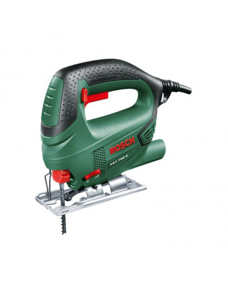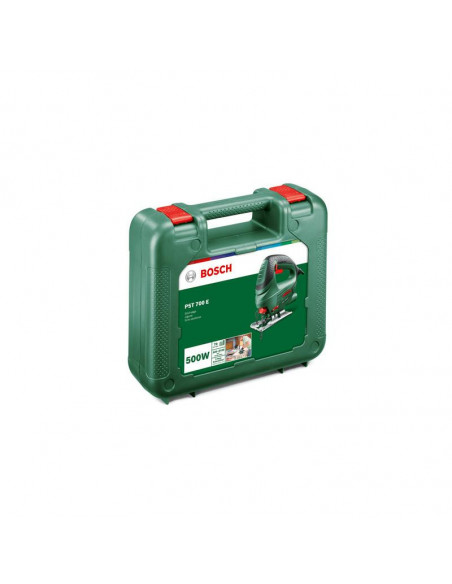 Bosch PST 700 E. Comprimento do cabo: Punho superior, Cor do produto: Preto, Verde, Vermelho, Capacidade do bisel (máx.): 45°. Velocidade em vazio (máx.): 3100 spm, Corte profundo em madeira: 7 cm, Velocidade em vazio (mín.): 500 spm. Fonte de alimentação: AC, Potência de input: 500 W, Potência de saída: 300 W. Peso: 1,7 kg ;