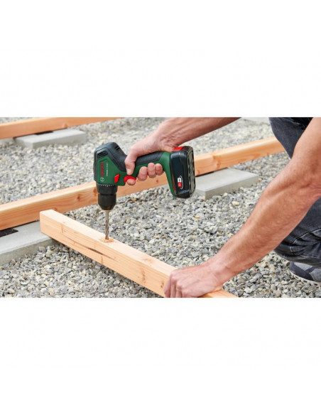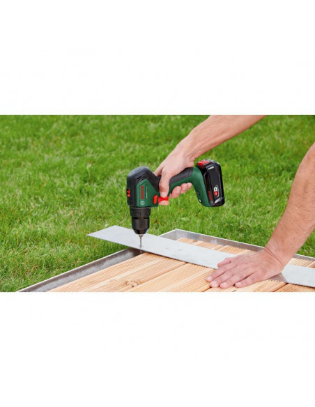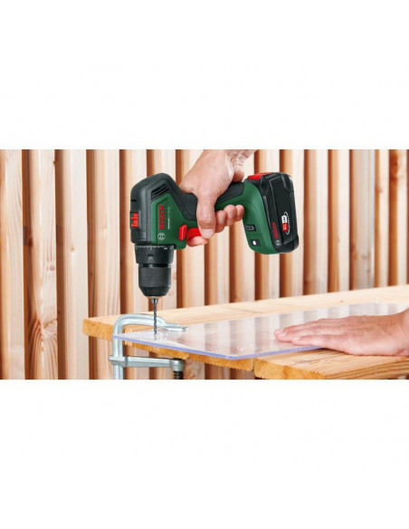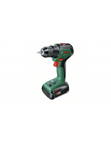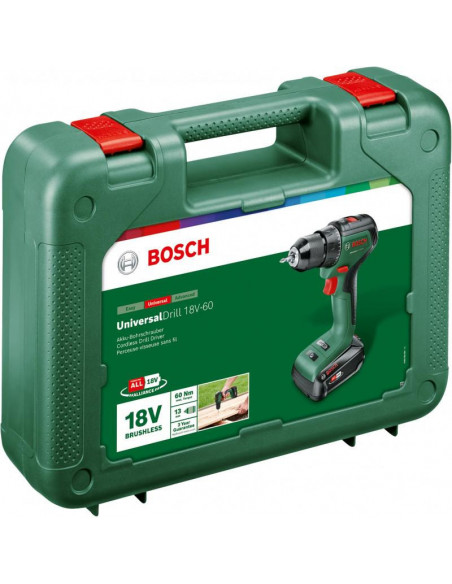 Bosch UniversalDrill 18V-60. Design de produto: Berbequim, Tipo de chave: sem chave, Tipo de motor: Sem escovagem. Capacidade do mandril (max): 1,3 cm, Velocidade de marcha lenta (máx.): 1900 RPM, Diâmetro de perfuração na madeira (máx): 3,5 cm. Fonte de alimentação: Bateria, Tecnologia da bateria: Ião-lítio, Capacidade da bateria: 1,5 Ah. Peso: 1,3 kg, Largura: 56 mm, Profundidade: 165 mm. Número de baterias incluídas: 1 unidade(s) ;
