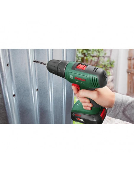 Bosch EasyDrill 18V-40. Design de produto: Berbequim, Tipo de chave: sem chave, Tipo de motor: Sem escovagem. Capacidade do mandril (max): 1,3 cm, Velocidade de marcha lenta (máx.): 1630 RPM, Diâmetro de perfuração na madeira (máx): 3 cm. Fonte de alimentação: Bateria, Tecnologia da bateria: Ião-lítio, Capacidade da bateria: 1,5 Ah. Peso: 1,3 kg, Largura: 57 mm, Profundidade: 180 mm. Número de baterias incluídas: 2 unidade(s) ;