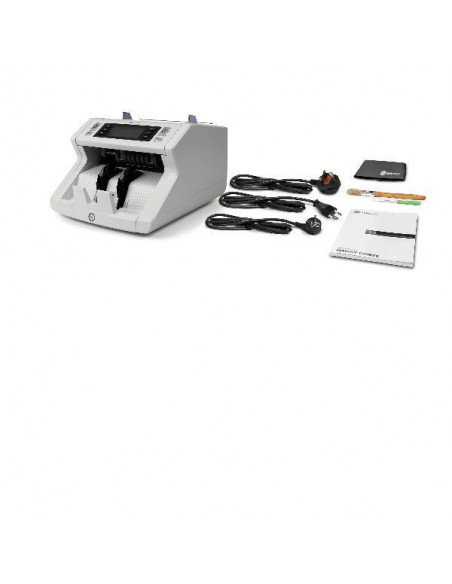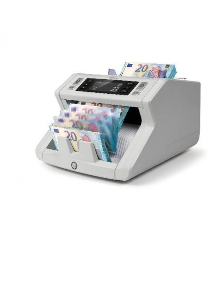Contador de notas Safescan 2250 (G2), robusto e eficiente para contagem e verificação de autenticidade de notas.  Velocidade de processamento de 1000 notas por minuto. Deteção de autenticidade através de raios UV e cabeça magnética.  Design compacto e visor integrado.