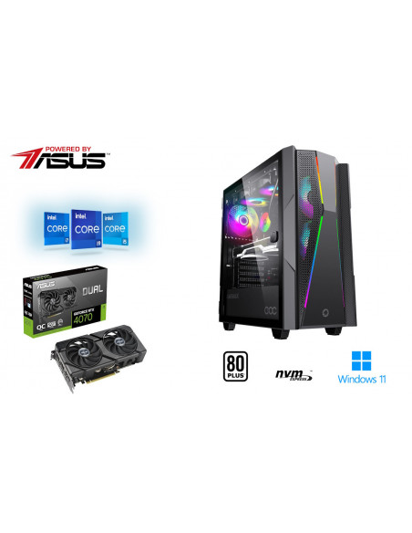 Este computador é equipado com um processador Intel Core i7-14700F de 14ª Geração, que oferece um desempenho excecional em jogos e aplicações multitarefa exigentes. A placa gráfica ASUS NVIDIA RTX 4070, com 12GB de memória dedicada, oferece visuais deslumbrantes e taxas de quadros altas, garantindo uma experiência de jogo suave e envolvente. A combinação destes componentes assegura um desempenho consistente e fiável, mesmo durante sessões de jogo prolongadas.