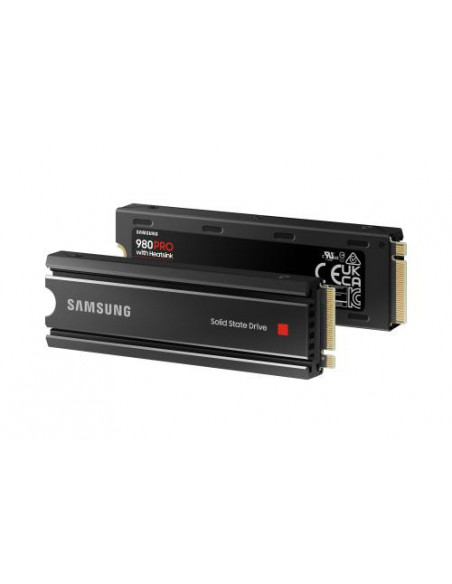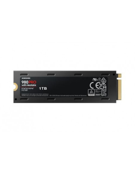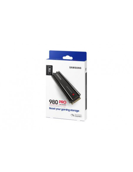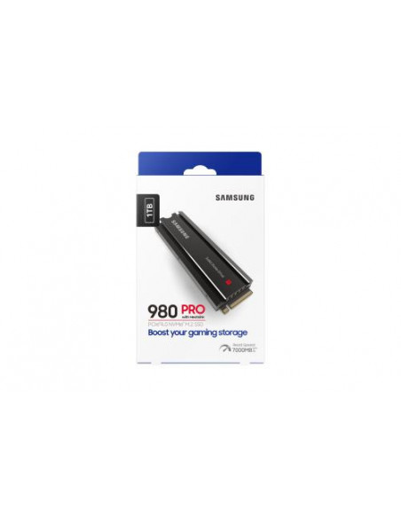Disco SSD Samsung 980 PRO de 1TB, com interface PCIe 4.0 NVMe e memória V-NAND MLC. Oferece velocidades de leitura de até 7000 MB/s e escrita de até 5000 MB/s, e inclui um dissipador de calor para melhor gestão térmica. Ideal para PCs de alto desempenho, com suporte para encriptação de hardware e tecnologias TRIM e S.M.A.R.T.